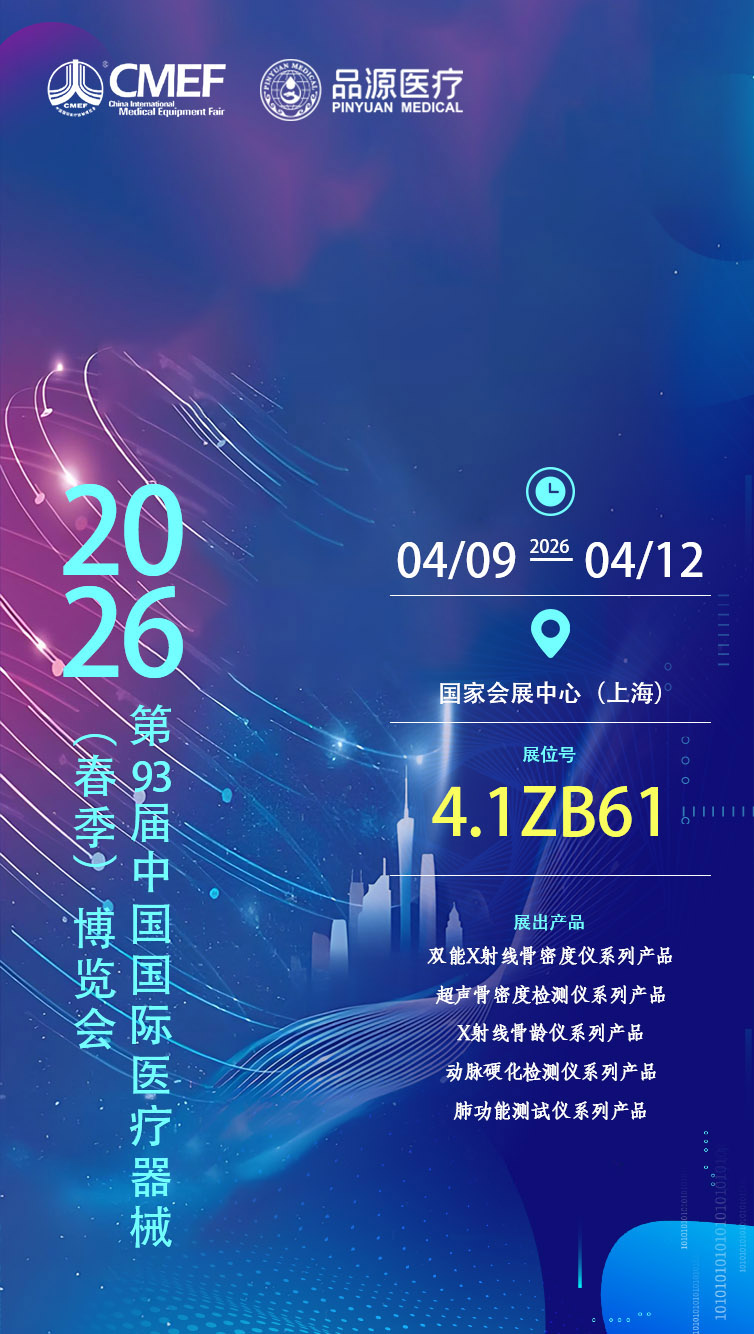 時隔一年,品源醫療再度赴約這場醫械行業盛會,屆時將攜雙能X射線骨密度儀、超聲骨密度檢測儀、X射線骨齡儀、動脈硬化檢測儀、肺功能測試儀五大核心系列產品參展,全方位展示品牌在健康檢測、慢病篩查、生長發育評估等領域的技術積淀與產品實力,與行業同仁共話醫療發展新機遇。